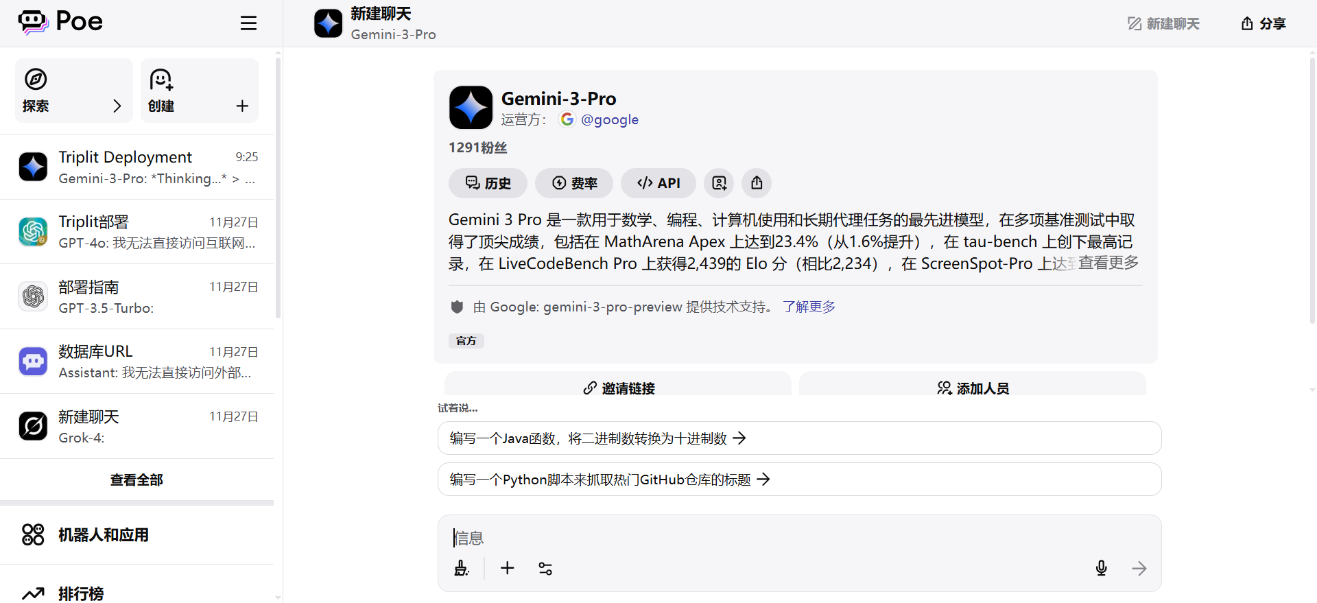 可以访问 GPT-5.1、Claude-Sonnet-4.5、Gemini-3-Pro、DeepSeek-R1 和 Veo-3.1、Grok-4